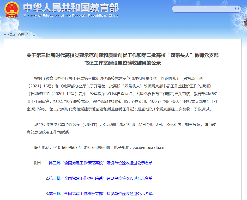 本网讯 2024年8月27日,教育部公布了第三批新时代高校党建示范创建和质量创优工作和第二批高校“双带头人”教师党支部书记工作室建设单位验收结果,学院食品科学与工程系教工党支部顺利通过教育部验收,正式成为“全国党建工作样板支部”。