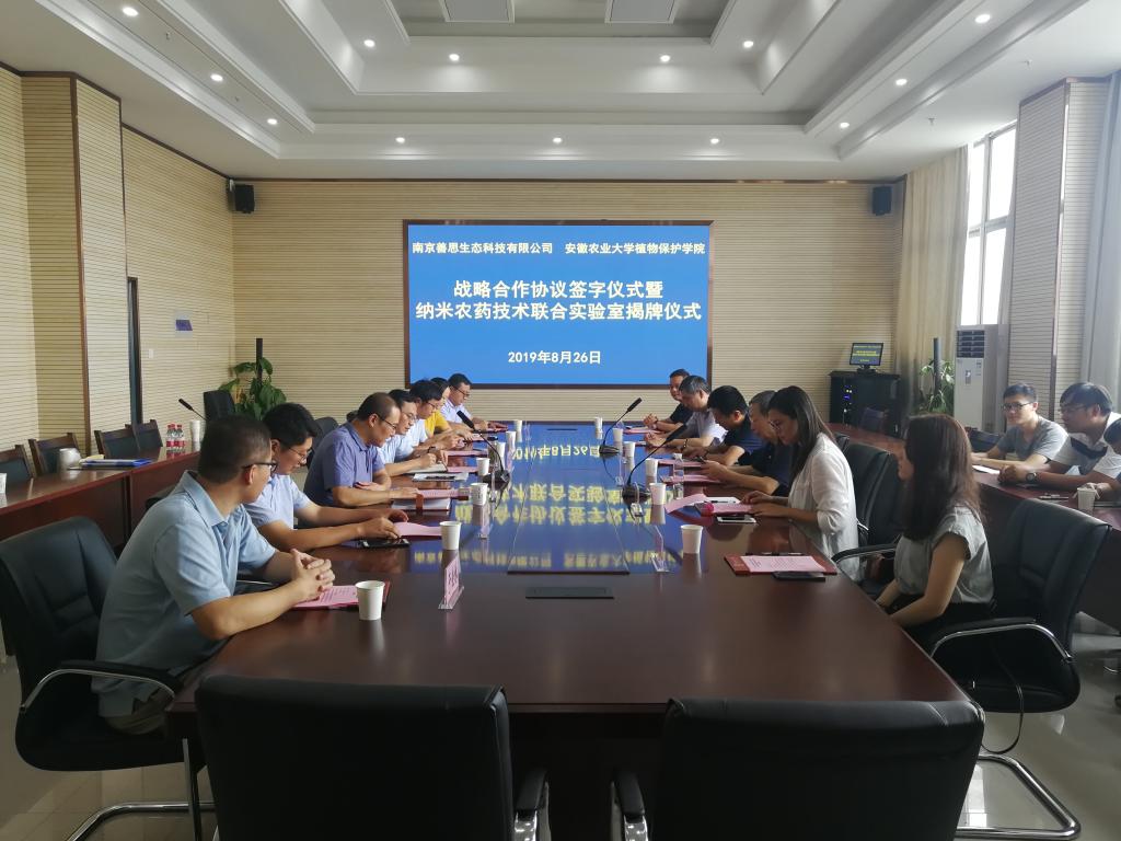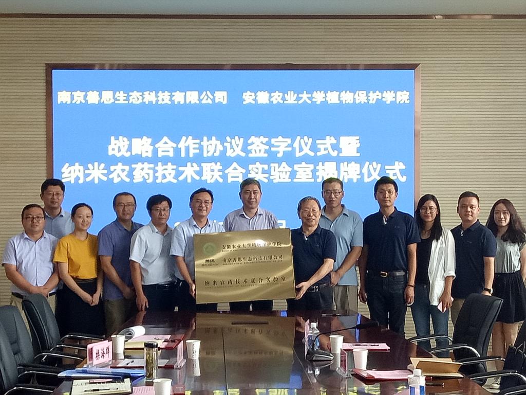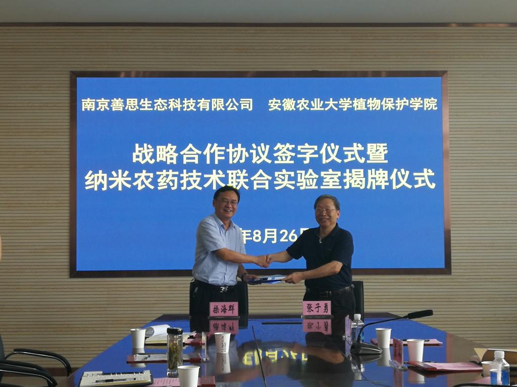 本网讯8月26日,“植物保护学院—南京善思生态科技有限公司战略合作协议签字仪式暨纳米农药技术联合实验室揭牌仪式”在植保学院举行。安徽省植保总站站长黄秋云,善思公司首席科学家、纳米科学研究院院长张子勇,首席执行官梁冰,研发中心总监、副院长胡珍娣,人力资源中心总监周围,人事专员郭宁宁,植保学院院长操海群,副院长潘月敏、周权,各系主任,教职工代表参加仪式。仪式由周权主持。