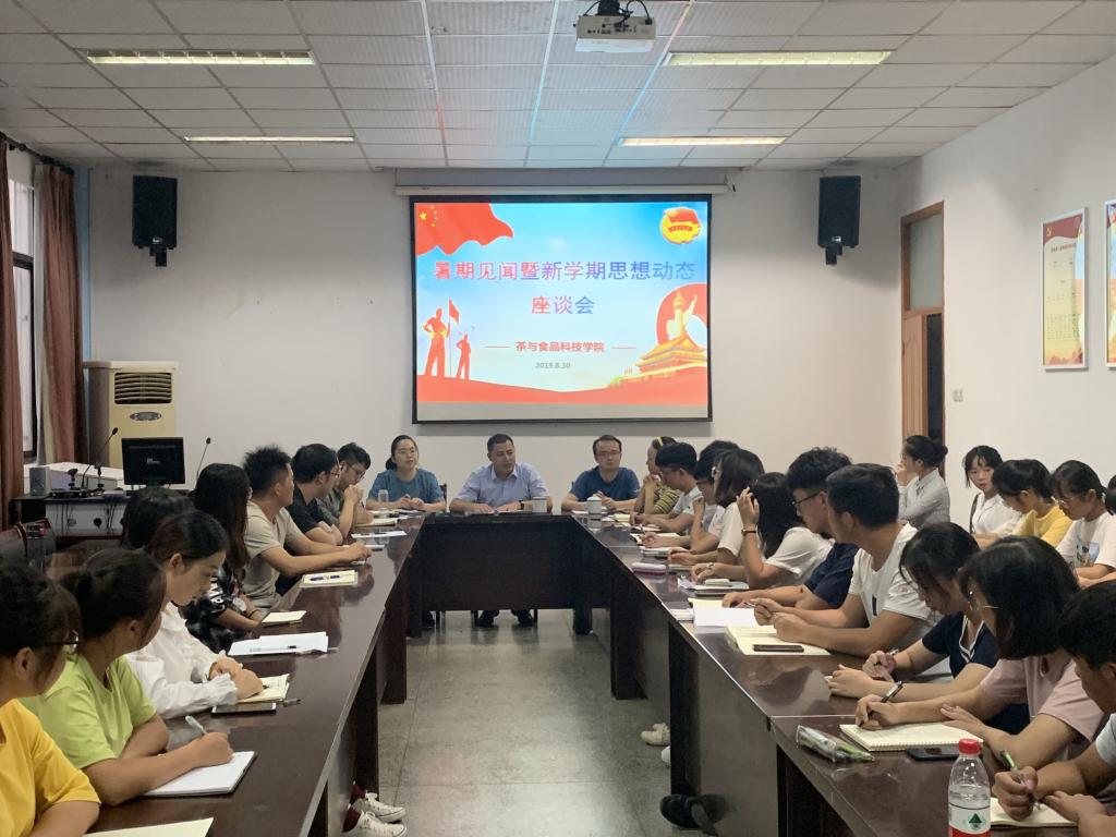 本网讯8月30日,茶与食品科技学院在茶业楼105室召开暑期见闻暨新学期思想动态座谈会。学院党委副书记、纪委书记、副院长张国学、学院办公室老师、参加暑期社会实践的同学、团干部以及学生会部分学生代表参加了座谈会,会议由学院团委老师主持。