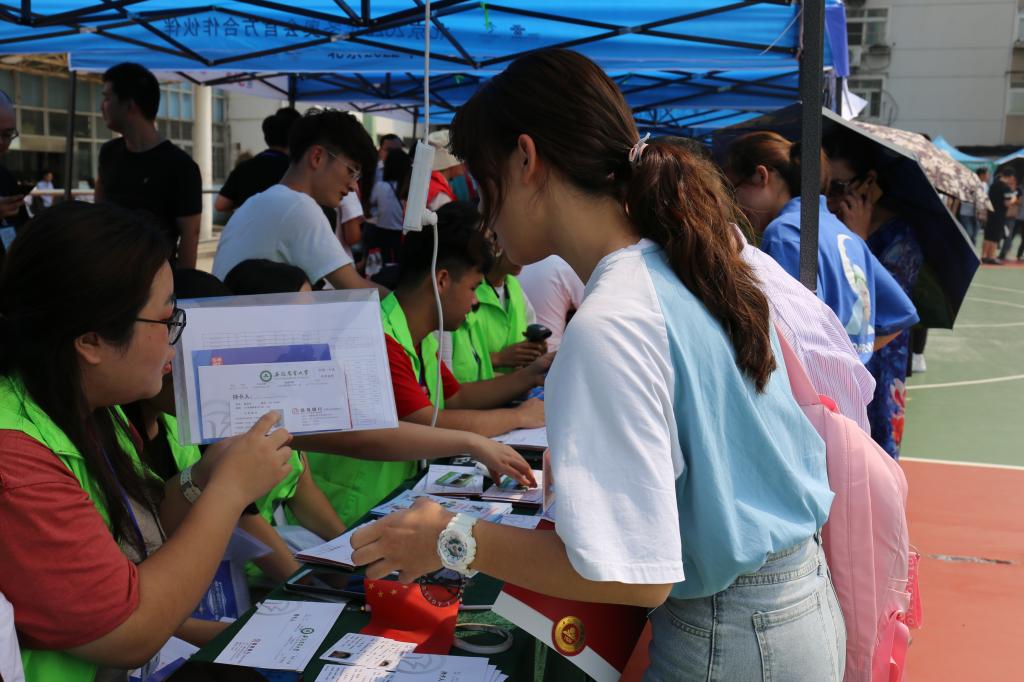 9月7日报到日,学院在第二运动场设立接待台,热情迎接前来报到的学院新生,学院党政领导、系部主任到场指导迎新工作,专职辅导员、新生辅导员全部到场。截止下午5点,学院计划录取360人,已完成报到351人。