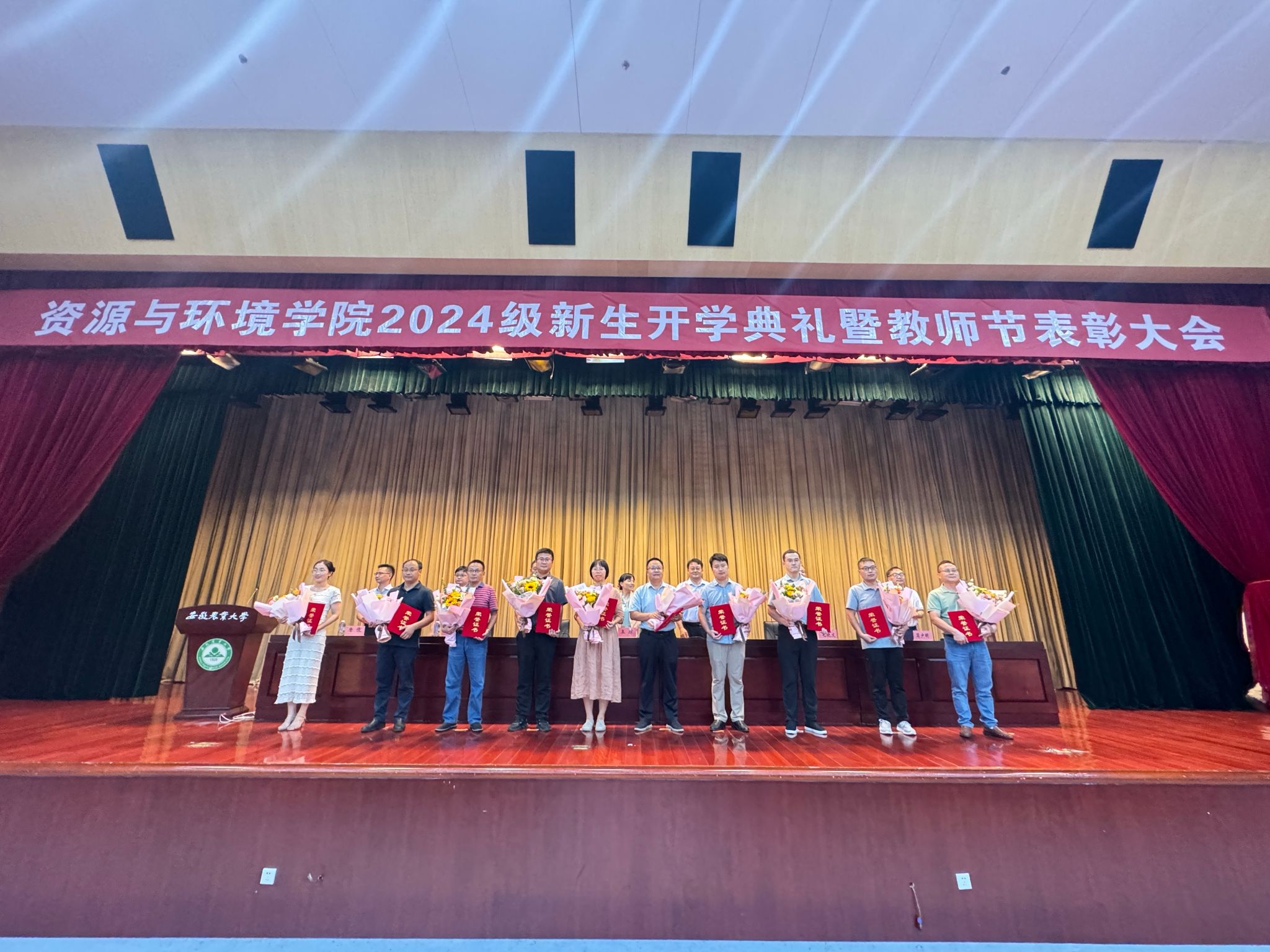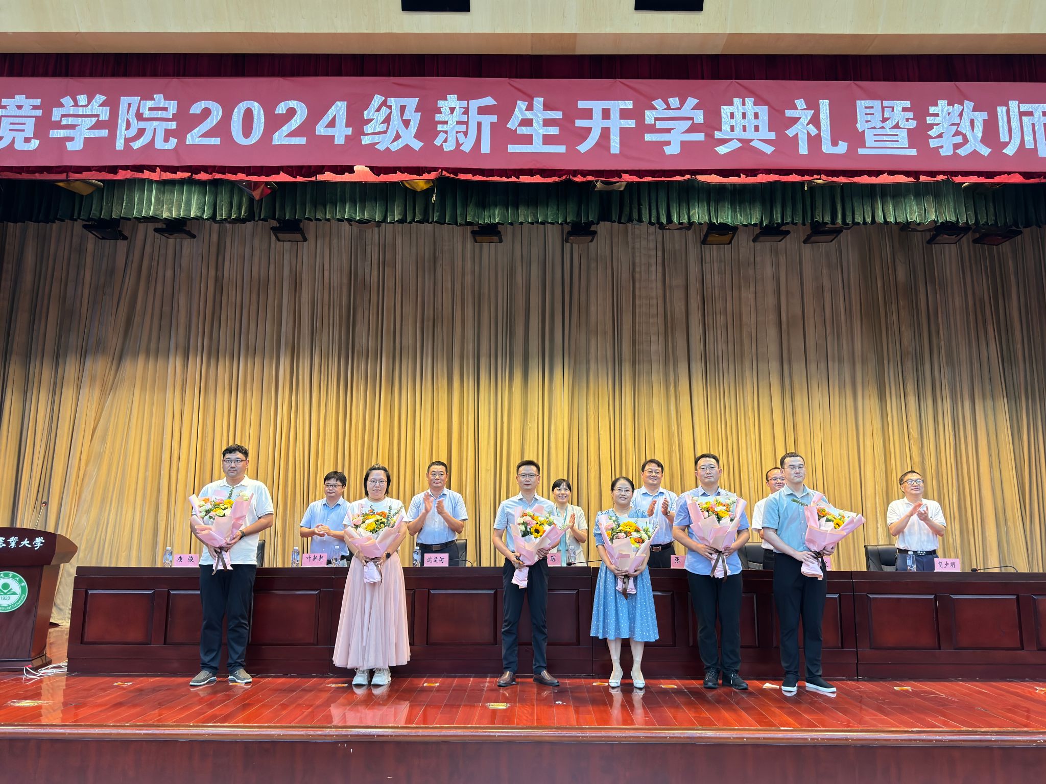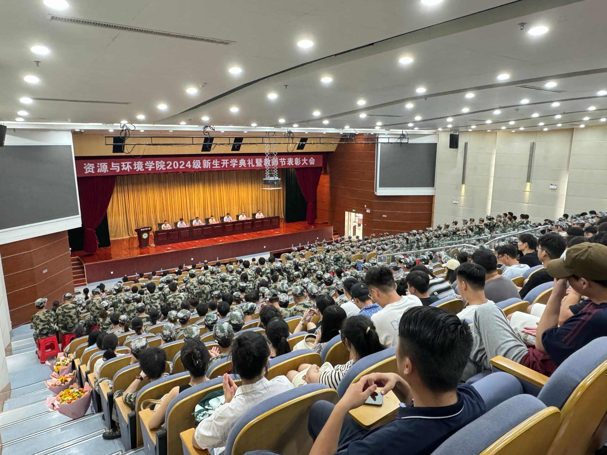 本网讯 9月2日下午,资源与环境学院2024级新生开学典礼暨教师节表彰大会在图书馆第一报告厅隆重举行。学院党政领导、系部教师、校友代表、军训教官、专兼职辅导员以及2024级全体新生共同参加典礼。