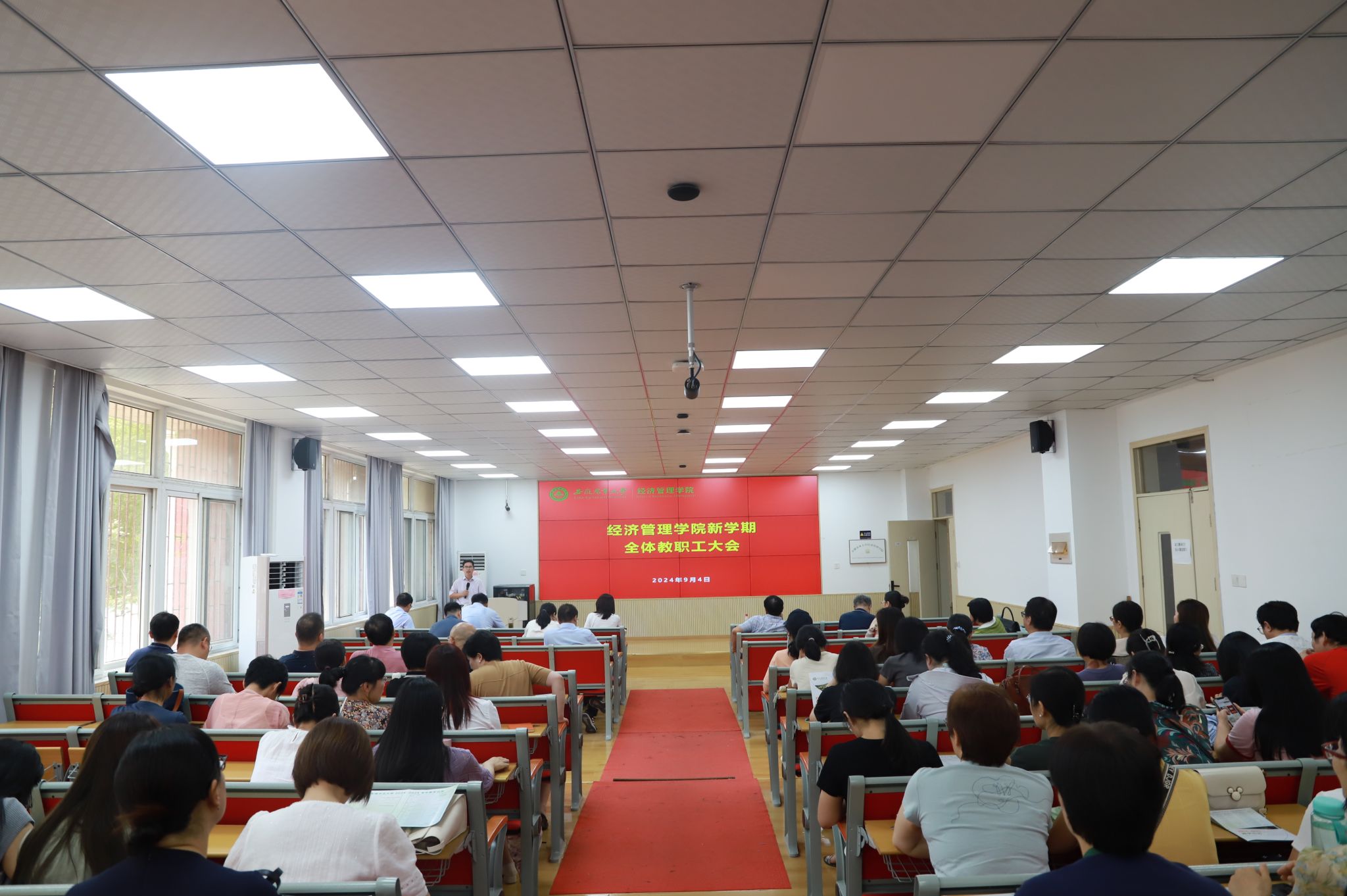 本网讯 9月4日下午,经济管理学院新学期全体教职工大会在经管楼103会议室召开。学院班子成员及全体教职工参加会议。会议由学院党委副书记、纪委书记周涛主持。
