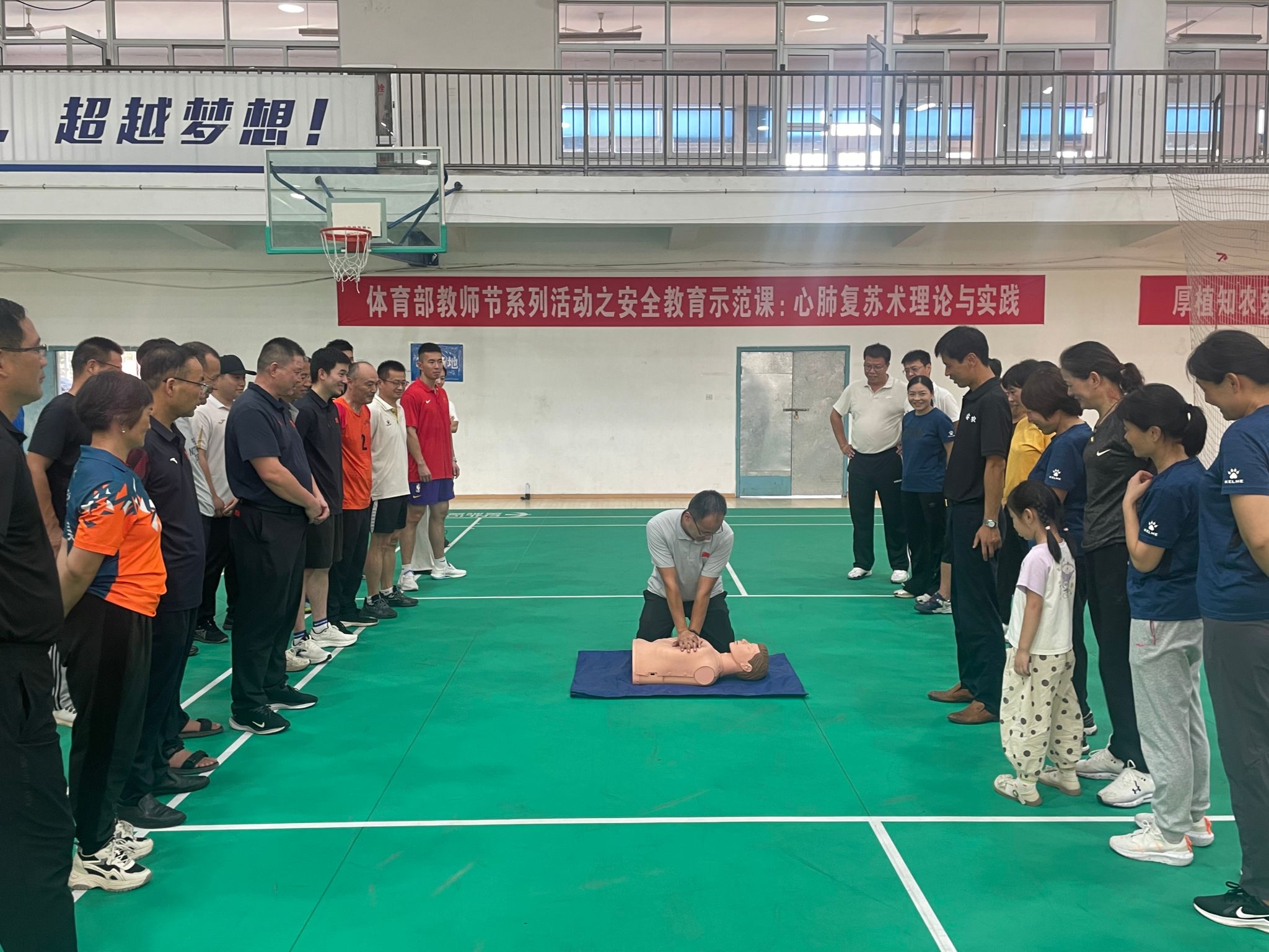 本网讯 9月9日下午,体育部在学校体育馆举办教师节系列活动之安全教育示范课,体育部全体教职工在课上重点学习了心肺复苏术等急救技能。