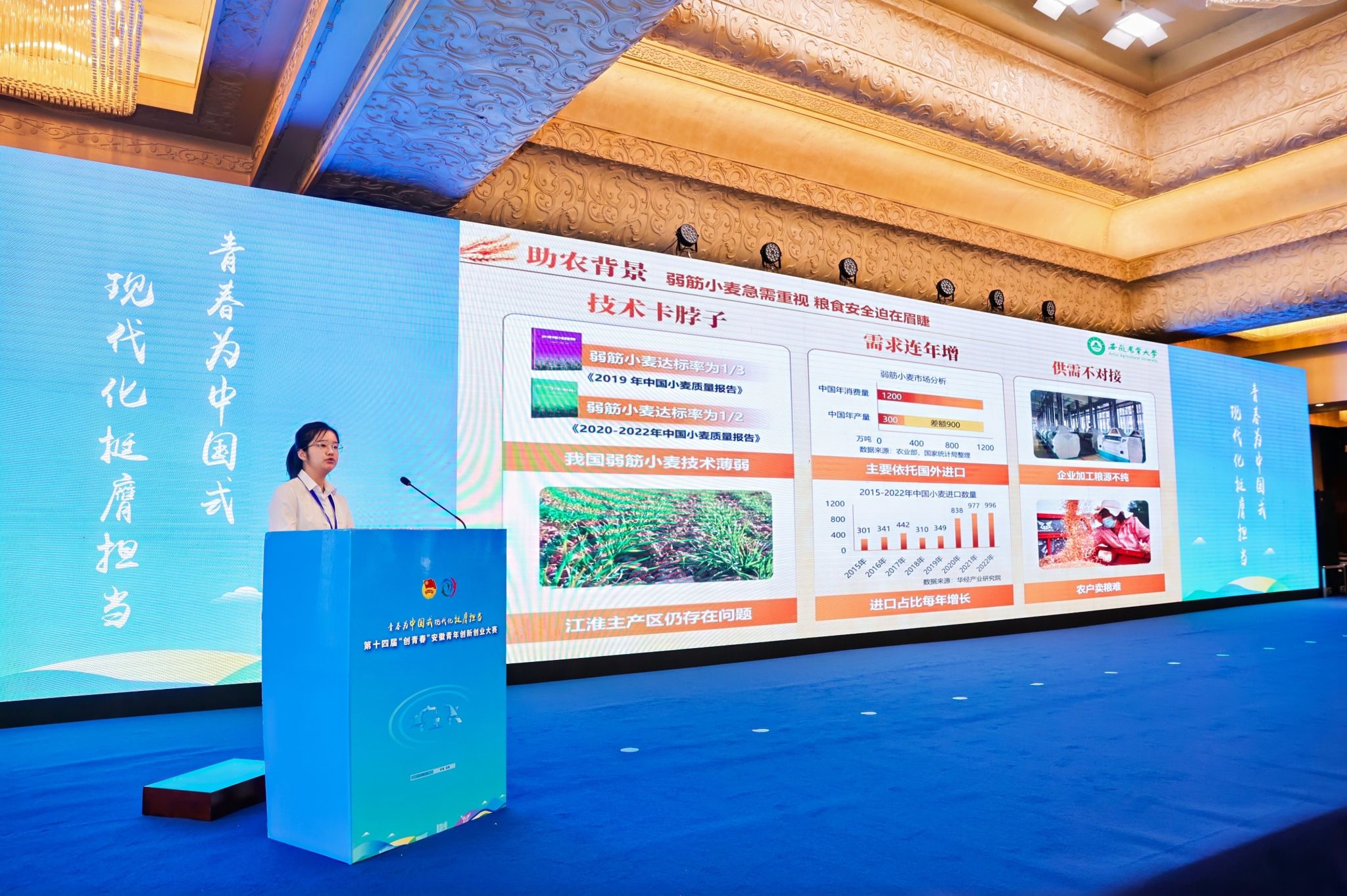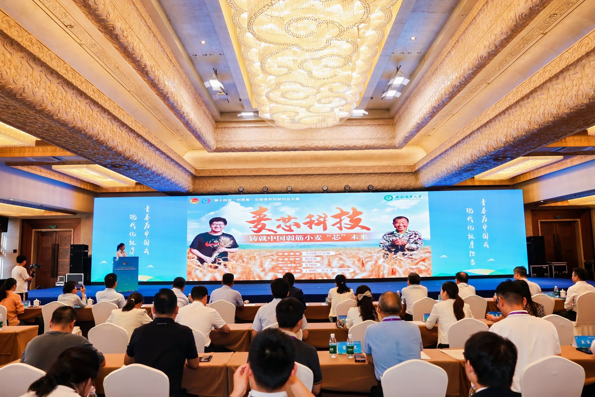本网讯 9月6日,第十四届“创青春”安徽青年创新创业大赛决赛在铜陵市落下帷幕。学院22级金融学张翔硕等同学的项目《麦芯科技——铸就中国弱筋小麦“芯”未来》荣获乡村振兴组金奖,并作为优秀项目代表在颁奖仪式上进行了现场路演展示。