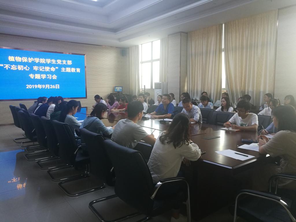 本网讯9月26日下午,植物保护学院学生党支部在学院会议室组织开展“不忘初心跟党走、牢记使命勇担当”主题党日活动,院党委书记檀根甲、学生党支部书记以及全体学生党员参加活动。