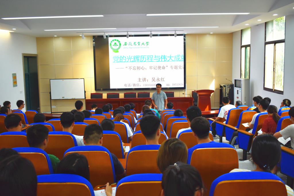 本网讯9月29日下午,园艺学院在二教247室举行“不忘初心、牢记使命”主题教育专题党课。学院党委副书记兼副院长吴永红以“从党的光辉历程与伟大成就中感受初心和使命”为题,为全院学生党员讲党课。