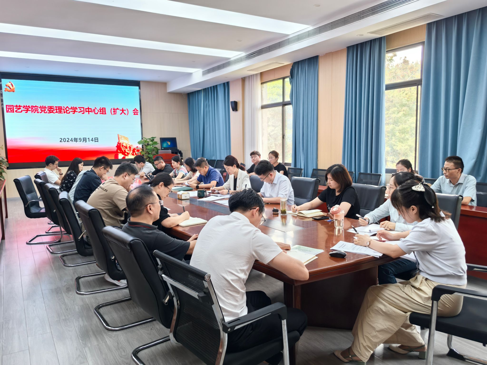 本网讯 9月14日下午,园艺学院在二教326召开党委理论学习中心组(扩大)会,会议由学院党委书记赵冠艳主持,学院党政领导班子成员、党委委员、纪委委员、各党支部书记、支委参加会议。