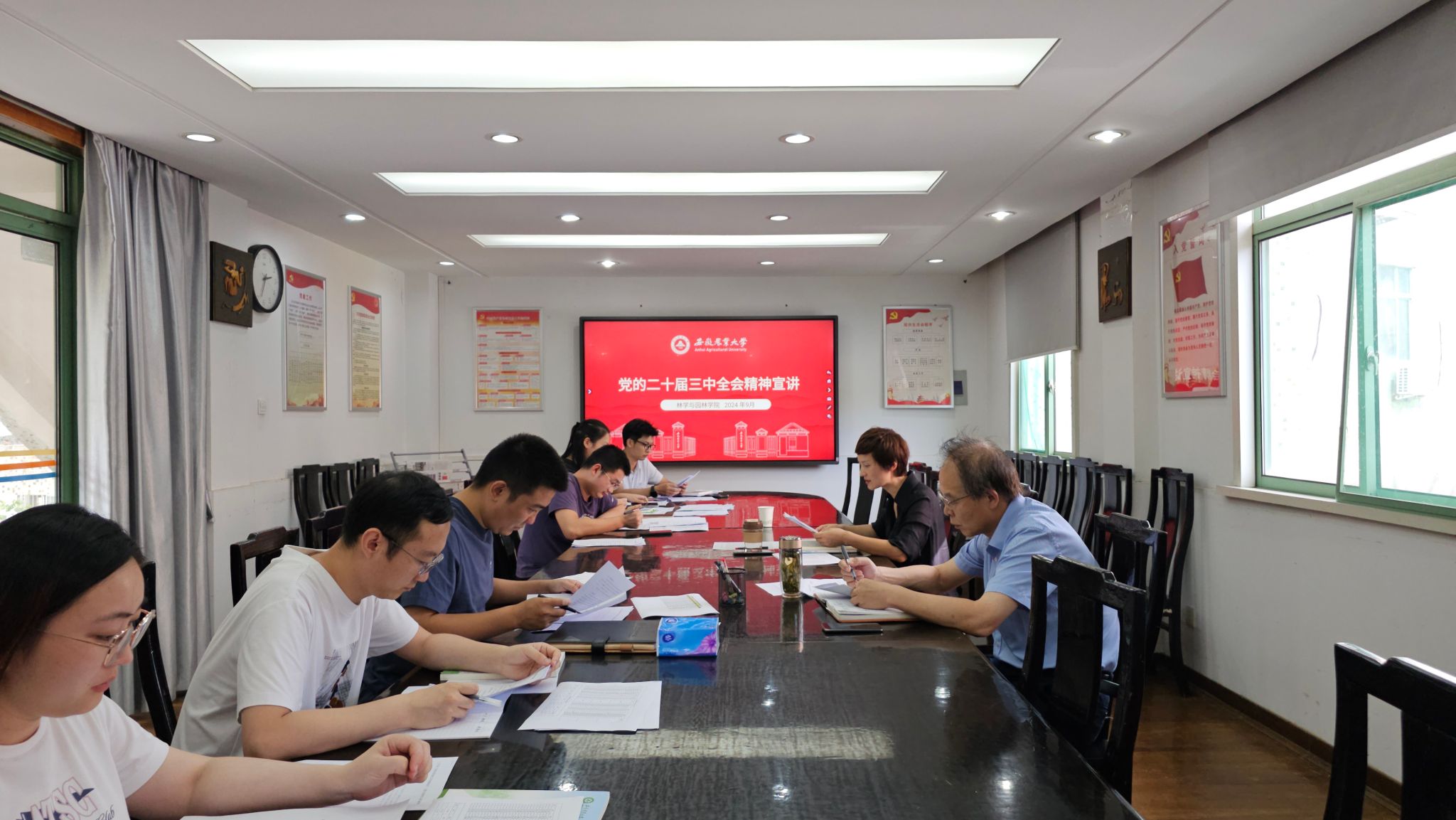 本网讯 9月19日下午,林学与园林学院组织思政工作队伍,专题学习党的二十届三中全会精神,学院党委书记江正君、全体专兼职辅导员参会,学院党委副书记夏利明主持会议。