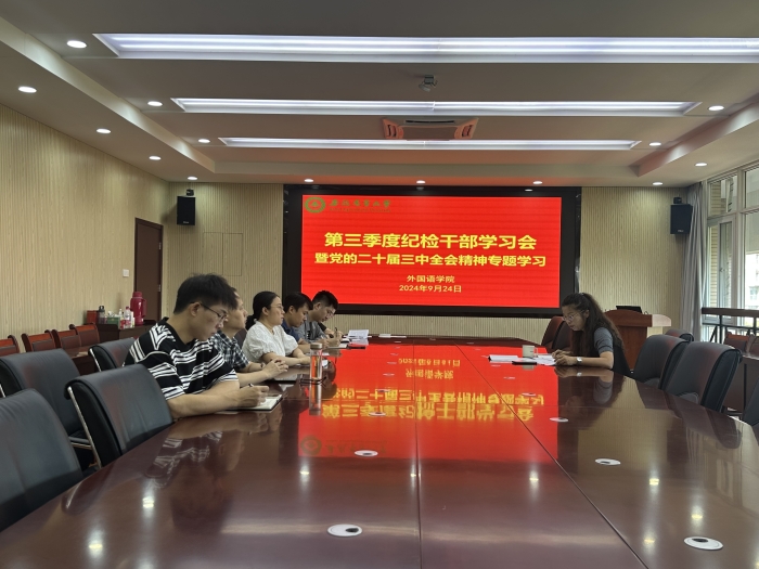 本网讯 9月24日上午,外国语学院在外语楼506会议室召开第三季度纪检干部学习会,专题学习党的二十届三中全会精神,学院纪委委员、党支部纪检委员参会,会议由学院党委副书记、纪委书记姬惠惠主持。