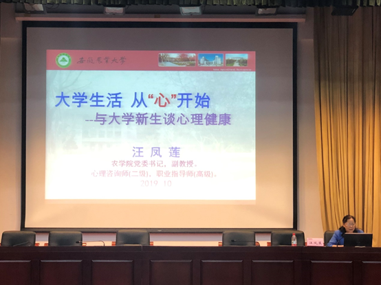 本网讯为了提高新生心理素质,帮助新生更快、更好地适应大学生活,10月11日下午,农学院在图书馆第一报告厅开展了以“大学生活,从‘心’开始”为主题的2019级新生适应性心理专题讲座,农学院党委书记、国家二级心理咨询师汪凤莲担任主讲,2019级全体新生聆听了讲座。