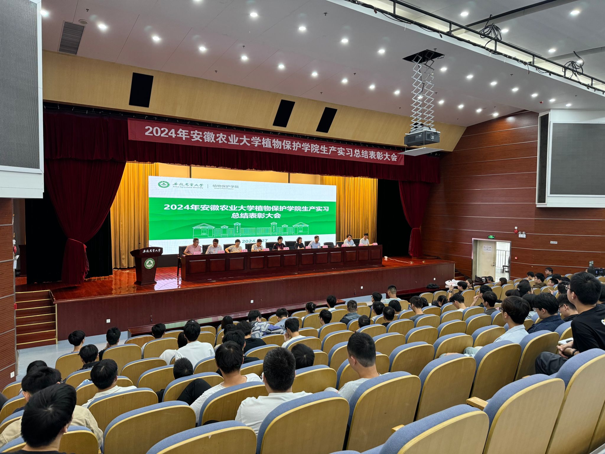 本网讯 9月27日上午,为深入学习贯彻党的二十届三中全会精神、全国教育大会精神,落实立德树人根本任务,提升实践教育教学水平,以良好的教风、学风迎接本科教育教学审核评估,植物保护学院在图书馆第一报告厅组织召开2024年生产实习总结表彰大会。安徽省植保总站四级调研员于淑琴,校社会合作处(技术转移中心)副处长陈雨,创新创业学院副院长、教务处副处长张志平,学院领导班子,实习队长,青年教师代表以及2024年参加生产实习的植物保护专业和智慧农业专业全体学生参加大会。会议由学院副院长方庆奎主持。