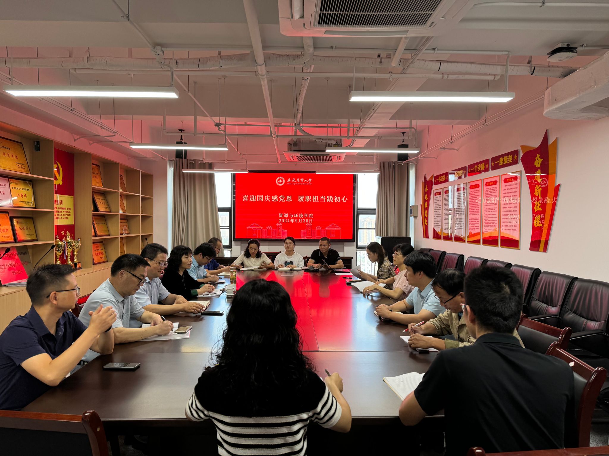 本网讯 为庆祝中华人民共和国成立75周年,进一步弘扬爱国主义精神,9月30日,资源与环境学院组织开展“喜迎国庆感党恩 履职担当践初心”主题党日活动,本次主题党日共分为“理论学习”“喜迎国庆、红色观影”“畅谈我与我的国”三个部分,学院党委委员、党支部书记参加活动。