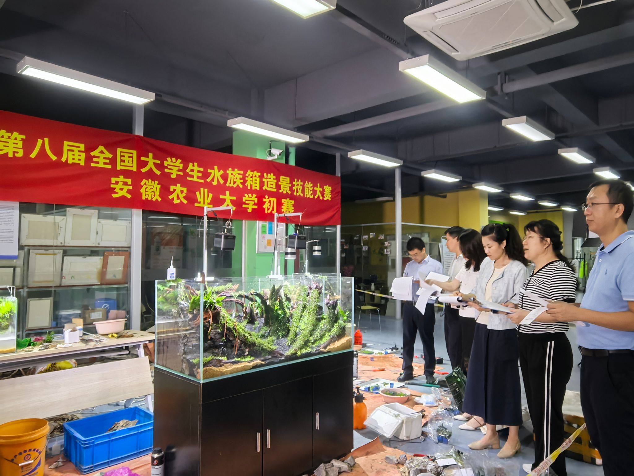 本网讯 9月30日,动物科技学院水产系举办第八届全国大学生水族箱造景技能大赛校内选拔赛。校党委学工部部长任琪、校团委书记武晓蓓、教务处副处长张志平以及学院党委书记沈兆梅等班子成员参加,学院实验中心副主任丁淑荃统筹指导本次大赛。