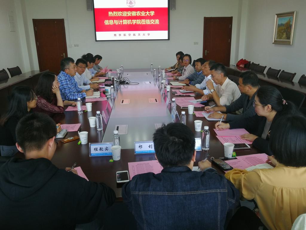 南京航空航天大学计算机科学与技术学院陈兵院长热情接待了曹俊一行。学习调研活动由南京航空航天大学计算机科学与技术学院副院长赵蕴龙主持。陈兵首先从学院概况、师资队伍、人才培养、科学研究、国际合作等方面介绍了该院的发展情况,张友华同志介绍了我校信息与计算机学院的情况。两学院有着相似的情况,都依托于行业谋发展,都曾是教学型单位,随后,双方围绕抓党建促发展、学科建设、人才引进、教育教学管理、研究生培养、招生就业、校院二级管理等开展了学习调研,为开展深入合作打下了坚实基础。
