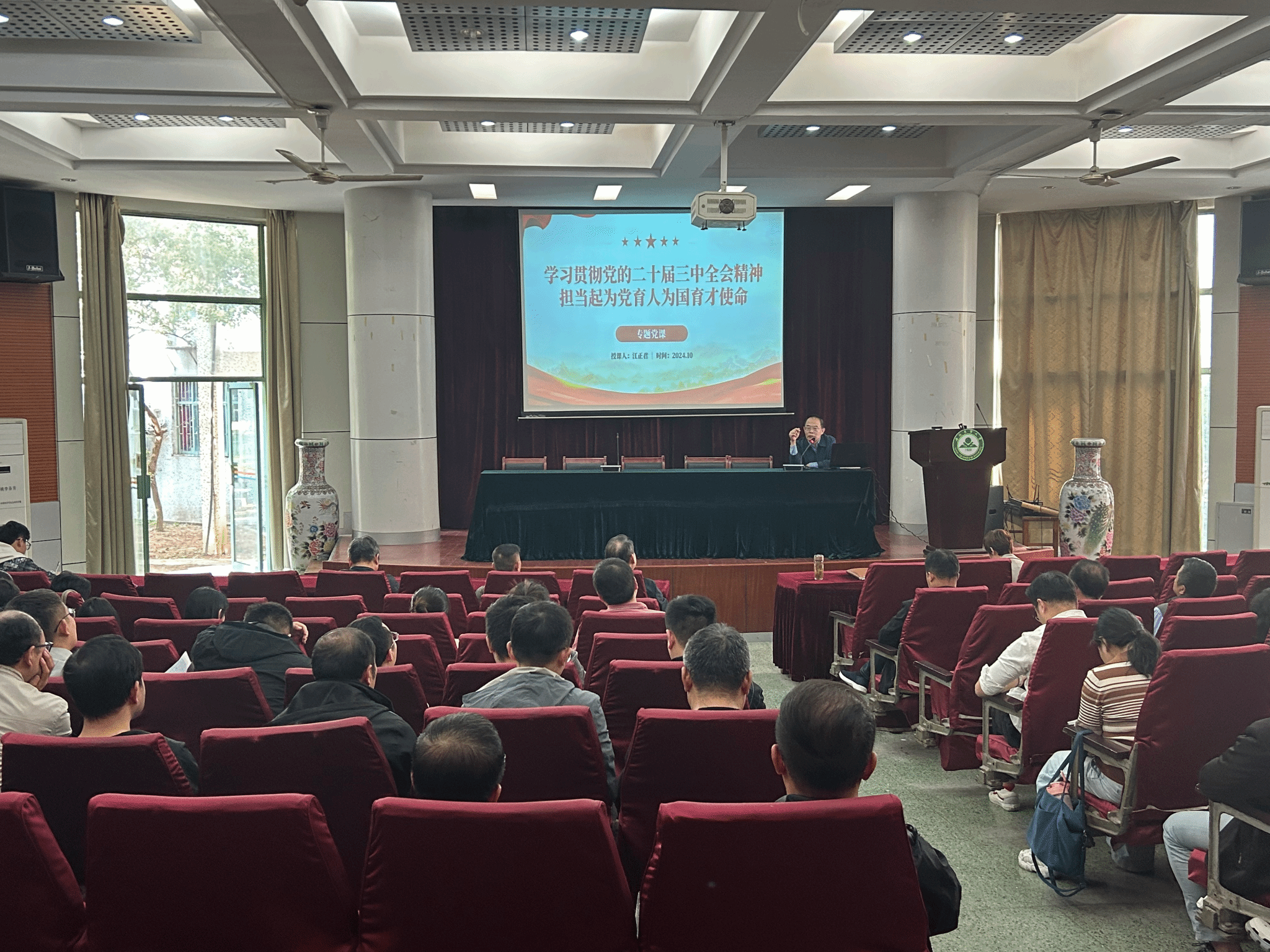 学院党委书记江正君作了题为《学习贯彻党的二十届三中全会精神 担当起为党育人为国育才使命》专题报告。江正君紧扣立德树人根本任务,重点阐述了党的二十届三中全会关于深化教育综合改革的重要论述、习近平总书记在全国教育大会上的重要讲话精神以及高校师德师风建设,并针对高校违反师德师风典型案例,在全体教职工中开展了一次深刻的警示教育。