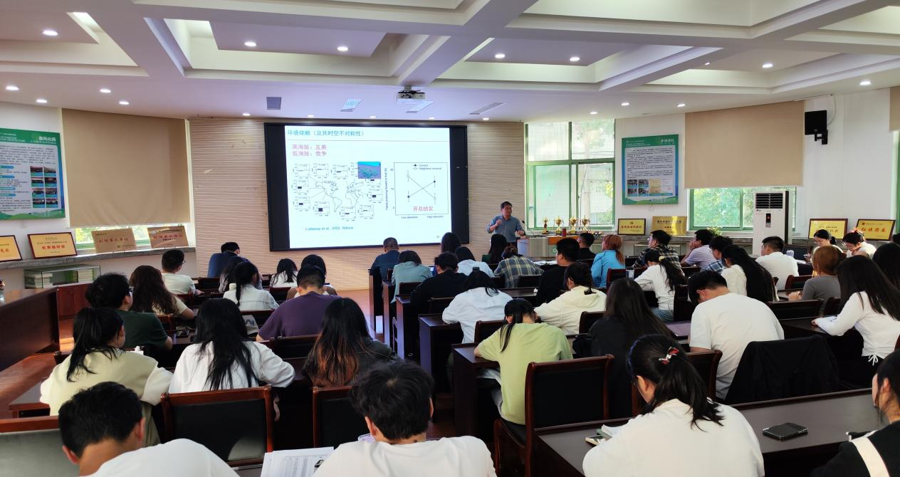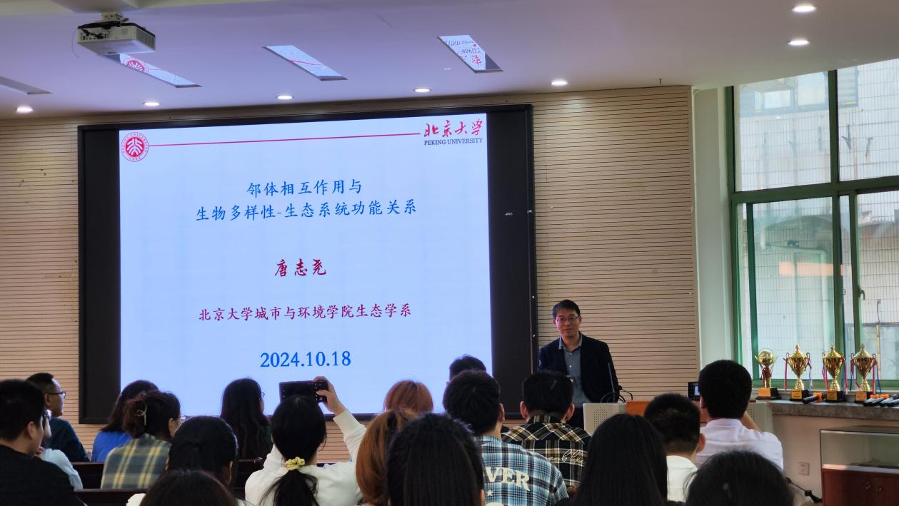 报告会上,唐志尧教授以“邻里相互作用与生物多样性-生态系统功能关系”为主题进行了深入探讨,强调了物种间相互作用在生态系统中的关键作用,并通过一些案例揭示了这些作用的复杂性及其对生态系统稳定性的影响;阐述了生物多样性对生态系统功能的双重影响,包括其对生态系统抵抗力、平衡的积极作用以及潜在的负面影响,并强调了人类活动对生物多样性的影响,倡导采取科学和可持续的生态保护措施。最后特别提及了他与我校杰出校友方精云院士展开的合作项目。唐志尧教授以其深厚的学术功底和生动的讲述方式,让大家对这一主题有了更加全面和深入的了解。