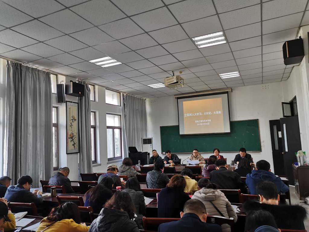 本网讯 为进一步聚焦落实立德树人根本任务,扎实推进“不忘初心、牢记使命”主题教育,11月20日下午,轻纺工程与艺术学院在学院四楼会议室围绕立德树人根本任务召开了“大学习、大讨论、大落实”专题会议。会议由学院党委书记王冬平主持,学院全体教职工参加会议。