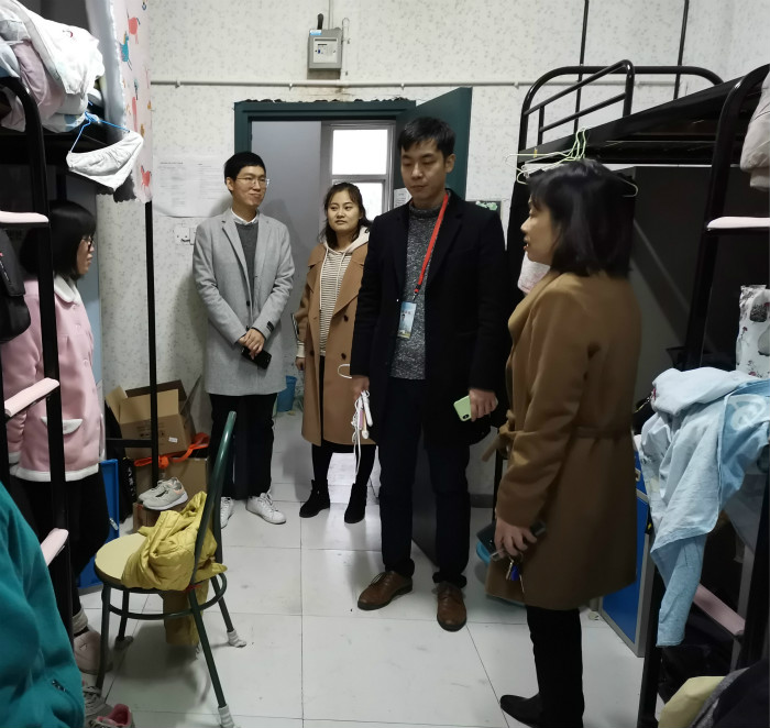 走访过程中,倪健一行重点对宿舍用电安全、防火、防盗及环境卫生等诸多方面进行了检查,向同学们进一步强调了严禁在宿舍内私拉电线、使用电热毯、电热汀、烘鞋器,电饭锅、电炉、热得快、蜡烛、酒精炉等发热电器和明火器具。经检查发现,各宿舍安全状况普遍良好,地面、桌面干净整洁,用电合理、安全。同时,对于个别宿舍发现的安全隐患及卫生问题也现场提出并立即整改。