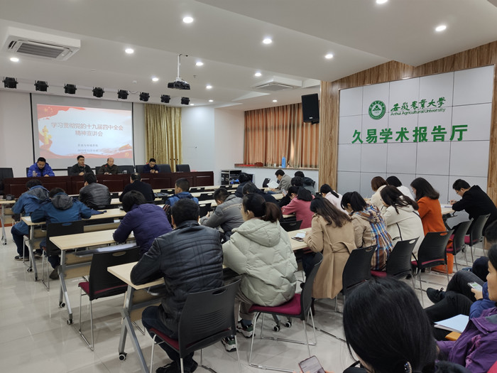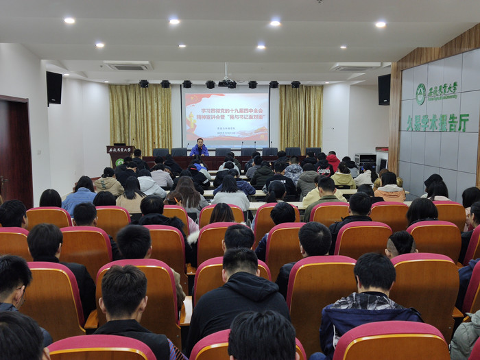 又讯 12月12日,资源与环境学院党委副书记张晓伟面向全体学生党员、入党积极分子和学生骨干开展学习贯彻党的十九届四中全会精神宣讲。(朱晓晨通讯员:程玉峰)