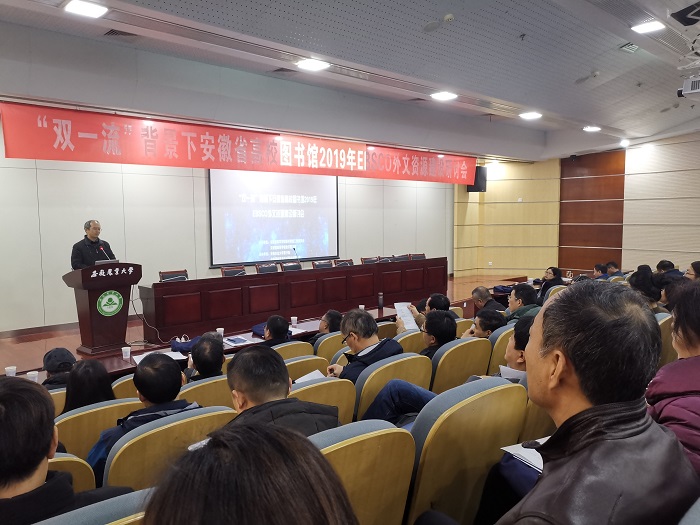 本网讯 12月17日下午,为更好地助力图书馆资源优化配置与服务管理,提升“双一流”背景下的学科服务水平,由安徽省高等学校图书情报工作委员会、安徽省高等学校数字图书馆主办,安徽农业大学图书馆、合肥蓬桉数据技术服务有限公司承办的“‘双一流’背景下安徽省高校图书馆2019年EBSCO外文资源建设研讨会”在我校图书馆第二学术报告厅成功举办。来自全省43所高校的74名图书馆负责人参加了此次会议。我校图书馆馆长吴文革主持会议。安徽省高等学校图书情报工作委员会秘书长、安徽大学图书馆馆长储节旺教授到会并致辞。