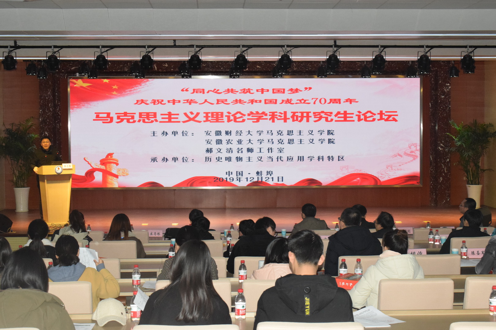 本网讯12月21日,由我校马克思主义学院、安徽财经大学马克思主义学院、淮北师范大学郝文清名师工作室联合主办,安徽财经大学“历史唯物主义当代应用”学科特区承办的“‘同心共筑中国梦’——庆祝中华人民共和国成立70周年马克思主义理论学科研究生论坛”在安徽财经大学龙湖东校区逸夫楼报告厅举行。来自中共中央党校、北京大学、北京交通大学、西安交通大学、东南大学、西南大学、南京师范大学、安徽师范大学、安徽农业大学、安徽财经大学、淮北师范大学等国内30多所高校的博士研究生、硕士研究生90余人参加论坛。论坛开幕式由安徽财经大学马克思主义学院党总支书记、院长张斌教授主持。