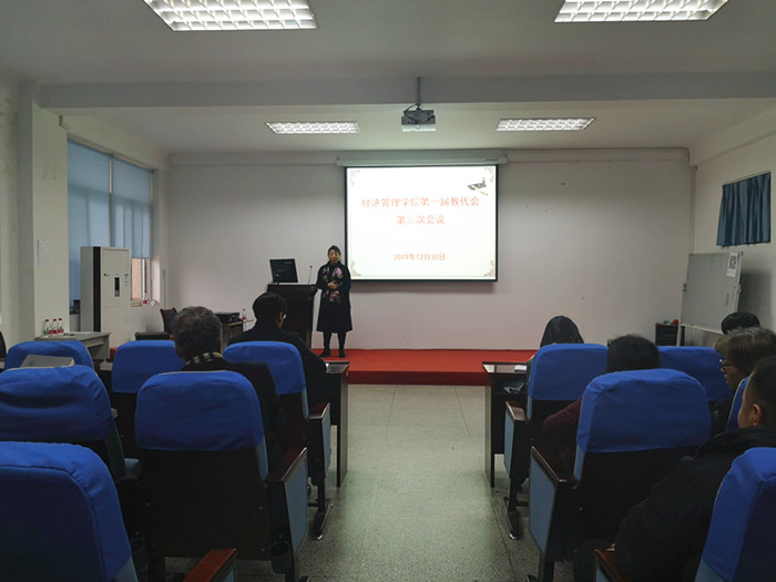 本网讯12月30日下午,经济管理学院一届三次教职工代表大会在经管楼321报告厅召开,学院全体教代会成员参加会议,院党委书记王伟主持会议。