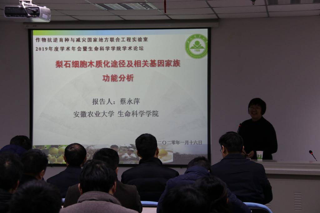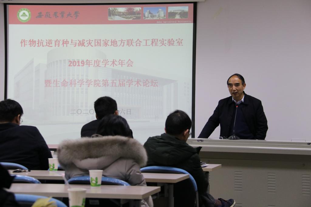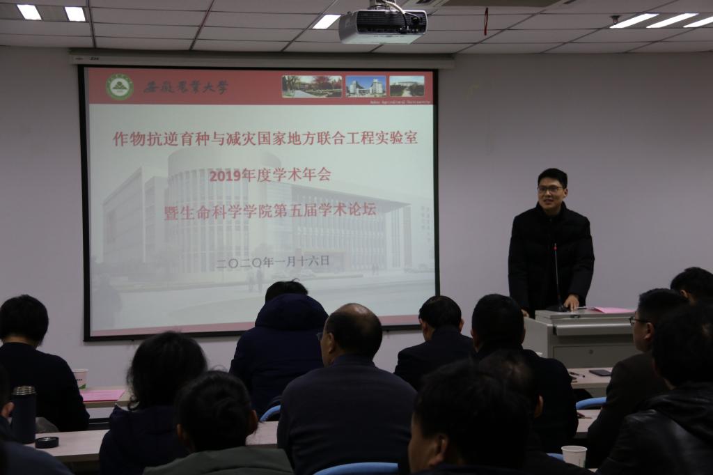 本网讯:1月16日,我校作物抗逆育种与减灾国家地方联合工程实验室2019年度学术年会暨生命科学学院第五届学术论坛在生物科技楼成功举办。实验室主任程备久、学院党委书记张健、常务副院长蔡永萍、学院党委副书记吴国卿、副院长江海洋出席了学术年会,学术年会由蔡永萍主持。国家地方联合工程实验室、全院教职工及研究生共计100余人参加。张健致辞表示学术年会的成功举办是全院的一件大事,相互交流才能共同提高,共同促进生物学学科向高水平发展。总共18位老师分别代表团队进行了总结汇报,并进行了充分的讨论与交流。