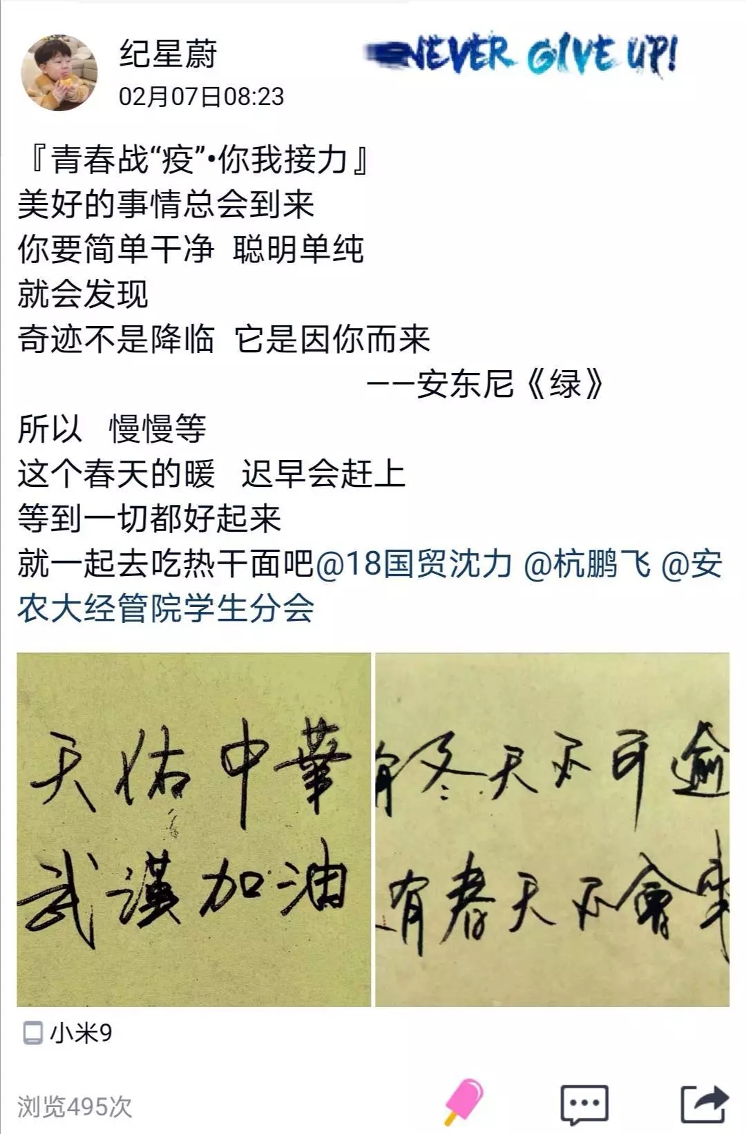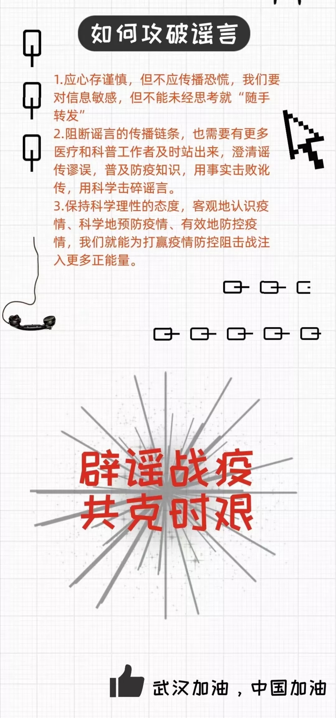 不畏艰难,战“疫”必胜。我们始终坚信,没有一个冬天不可逾越,没有一个春天不会来临。在全国团结一心,共同抗“疫”的情况下,一定能战“疫”成功。武汉加油!中国加油!(魏安康通讯员:杨金丹)