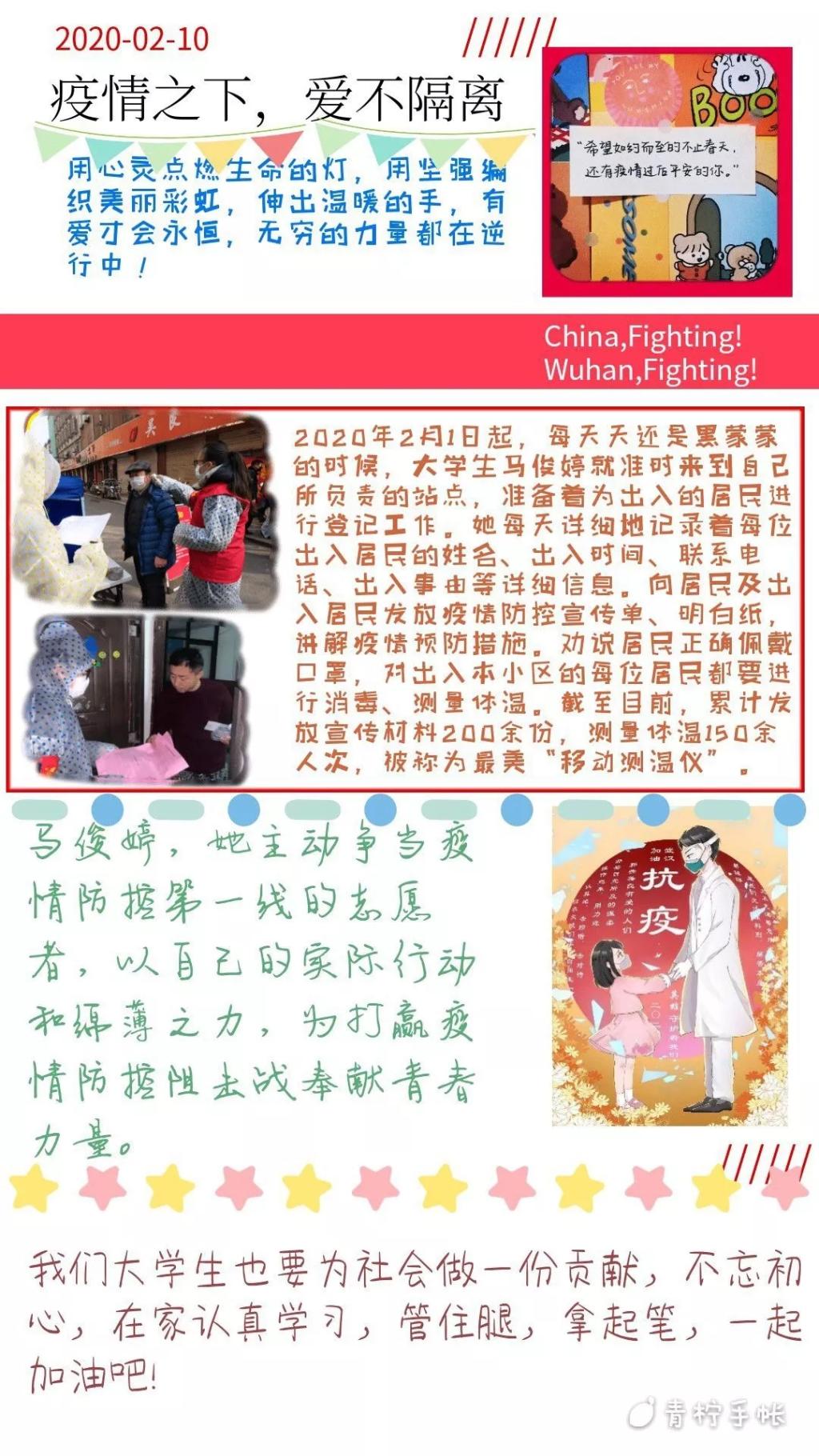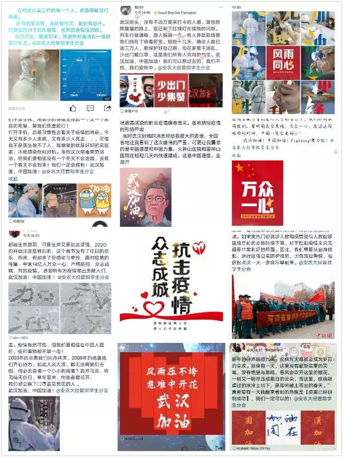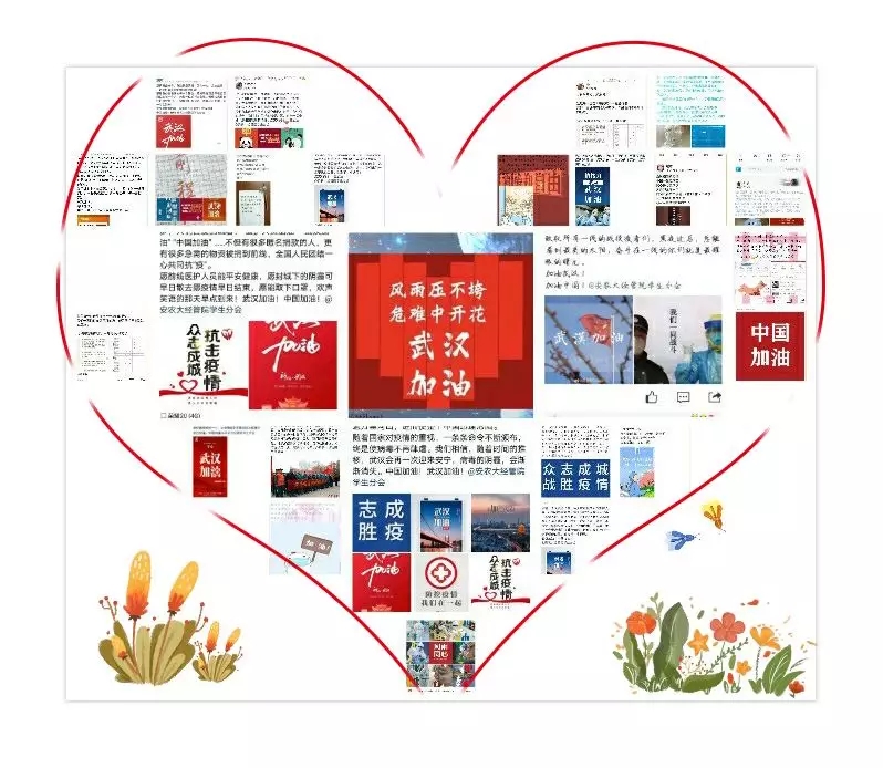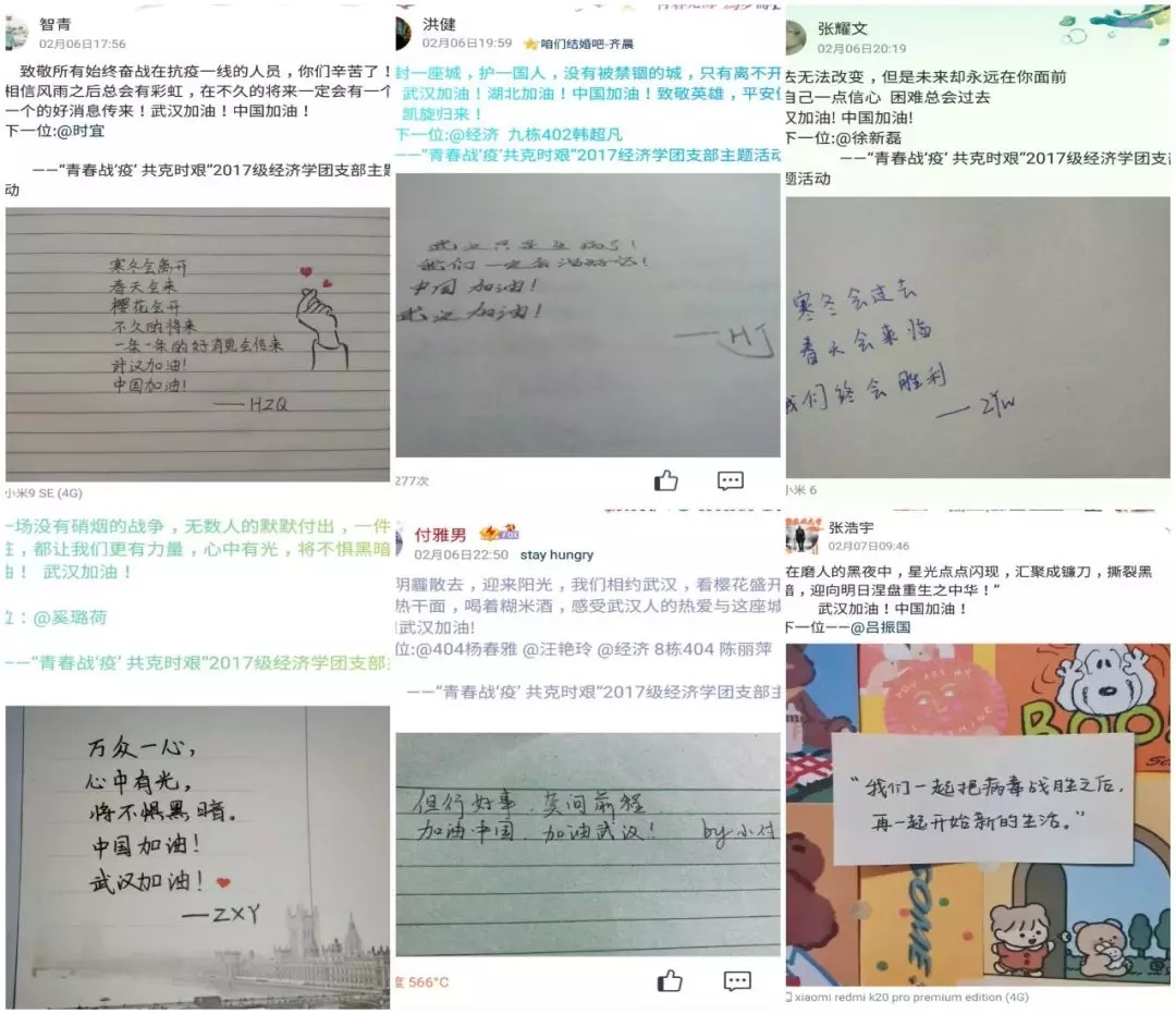 利用网络新媒体平台,学院开展手写祝福、自拍视频、祝福接力等线上活动,青年团员们纷纷参与其中,用自身力量为武汉、为湖北、为中国献上最真诚的祝福,传递温情正能量。