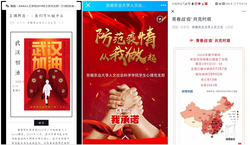 充分利用网络新媒体,加强防控知识宣传,积极传播正能量,引导学生不信谣、不传谣,号召学生在党的领导下同心抗疫。组织师生参加“防疫健康教育主题学习实践活动”,组织各团支部开展主题团日活动。学院新媒体“人文之光”公众号,制作推出疫情防控专题两期,学生新媒体工作室录制推送“武汉加油、祝福中国”视频。