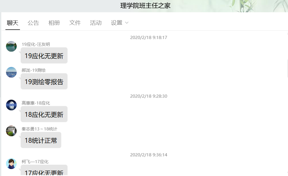 学院要求每位辅导员班主任老师必须与专业班级同学保持畅通的沟通渠道,每日定时汇报学生健康信息,并通过QQ群等信息网格化管理平台,准确全面掌握每位同学行程动态和健康情况。