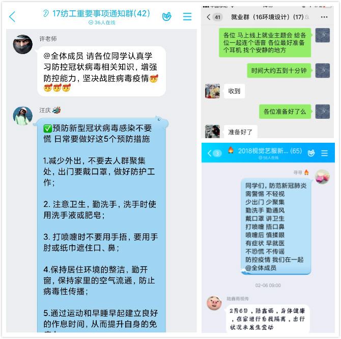 本网讯:疫情就是命令,防控就是责任。在校党委的坚强领导下,轻纺工程与艺术学院严格落实各项通知部署,紧紧依托QQ群、微信群、易班网、钉钉等线上交流方式,组织各班级学生自觉主动抗击疫情。