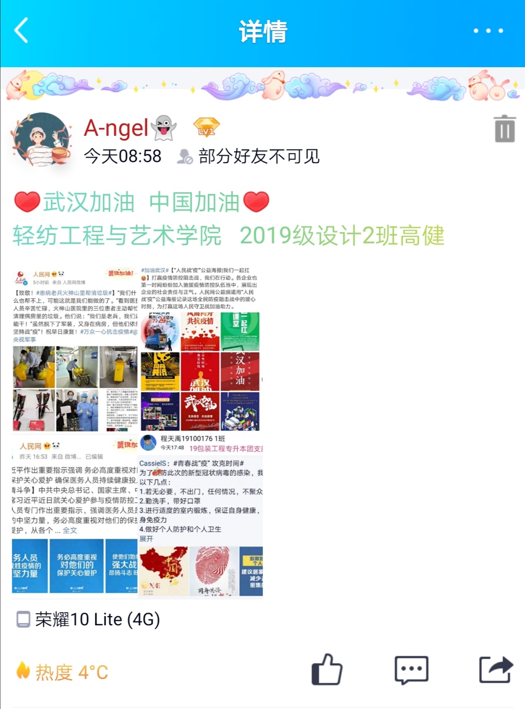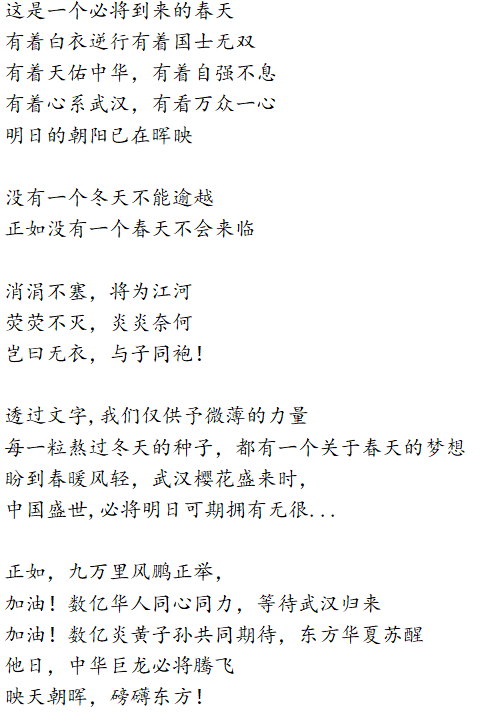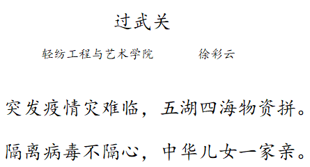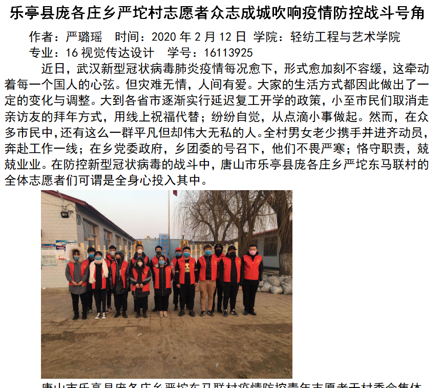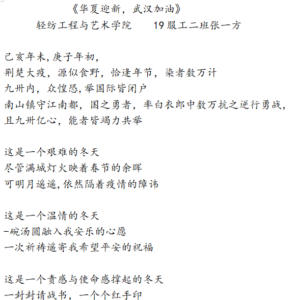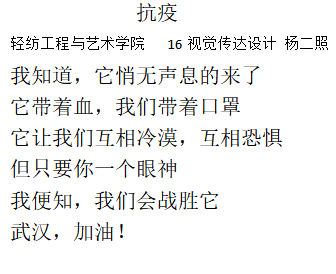 党有号召,团有行动。疫情发生以来,学院广大团员青年积极向所在社区(村)报到,主动申请加入到疫情防控志愿者队伍中,以实际行动亮身份树形象,听从指挥,发挥作用,在做好自身安全防护的前提下,依法科学有序参与疫情联防联控,积极投身到疫情防控一线,为打赢新型冠状病毒肺炎疫情防控阻击战,为爱发声。在抗击疫情的关键时刻,轻纺学子录制原创诗歌朗诵作品《华夏迎新,武汉加油》,诗歌由2019级服装设计与工程张一方同学作词,由马媛媛、钟银子等同学共同朗诵,用声音的激情展示诗歌的力量,激发青年学生抗击新冠疫情的斗志,众志成城,共克时艰,跟着春天去迎接胜利的曙光!武汉加油,中国加油!