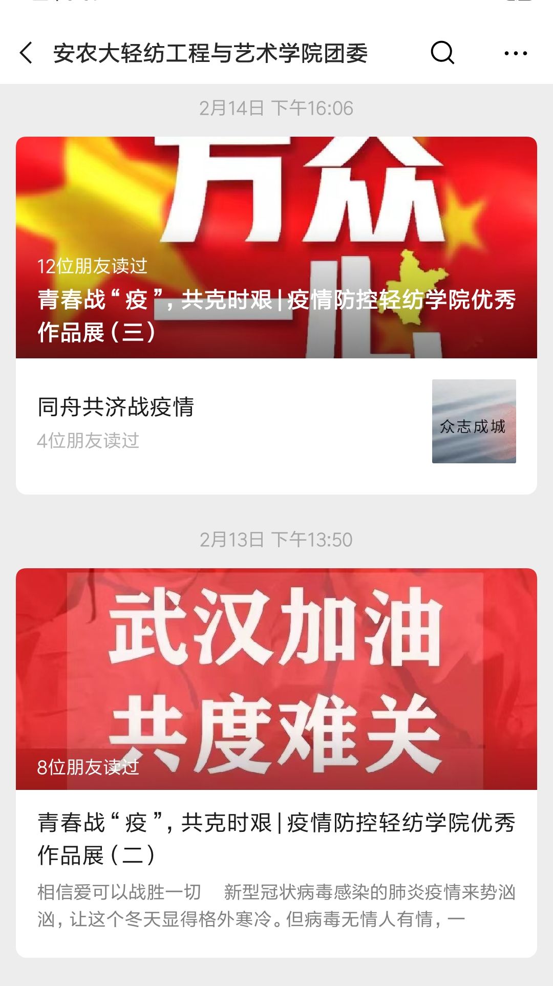 本网讯:为深入贯彻落实习近平总书记关于新冠肺炎疫情防控工作的重要讲话和指示精神,落实教育部、安徽省和我校关于疫情防控工作的相关部署,教育引导广大团员青年在参与疫情防控工作中厚植爱国主义情怀、强化责任担当意识、彰显拼搏奋斗精神、掌握疫情防控知识,为坚决打赢疫情防控阻击战贡献青春力量,结合我院实际情况,在全院团支部中开展“青春战‘疫’共克时艰”线上主题团日活动。