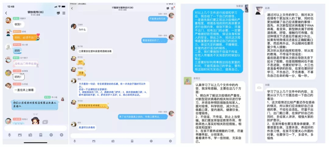 学院各团支部利用团支部微信群、QQ群等,组织动员团员青年开展防控疫情知识线上专题学习。各班团员青年主动将从学习强国、公众号、电视新闻等官方渠道获取的权威疫情进展,在班级群里进行宣传和交流。