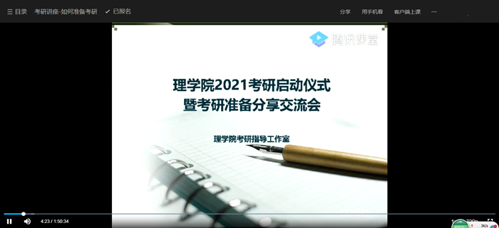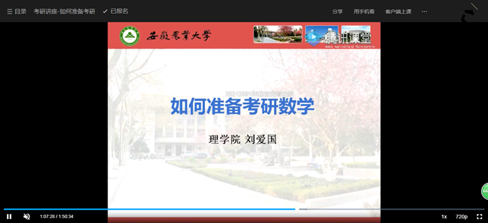 本网讯3月21日下午,理学院考研指导工作室开展线上考研指导讲座。讲座由学院统计系主任刘爱国副教授主讲,学院2017级有意向考研的同学在腾讯课堂上收看了直播。