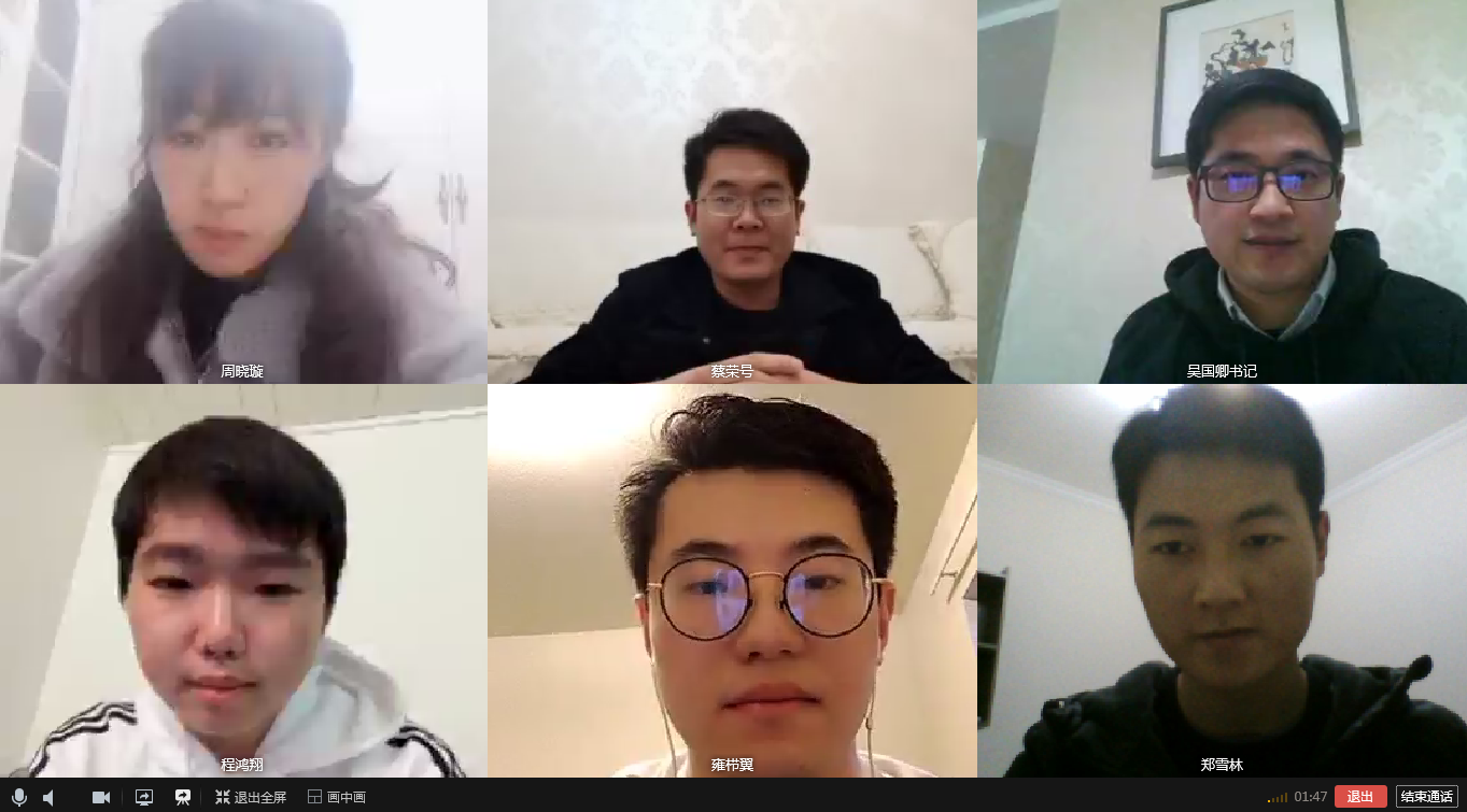 在师生交流环节中,同学们分享了疫情期间生活、学习情况和思想动态,以及目前面临的困难和问题,对学校、学院的关心表示感动,感谢老师时刻牵挂着远在异国他乡的他们,并表示会做好个人防护,不让老师和家长担心,也希望老师注意身体,平安健康,大家一起抗疫,共渡难关!老师们也进一步了解了同学们上网课的情况,询问了家庭经济困难的同学,并介绍学校在疫情期间临时困难补助等相关政策,提醒同学们在国外疫情爆发阶段一定要做到戴口罩、不聚集和勤洗手,做好疫情防控;海外求学要学会独立,遇事做到不恐慌,以积极的心态面对困难。
