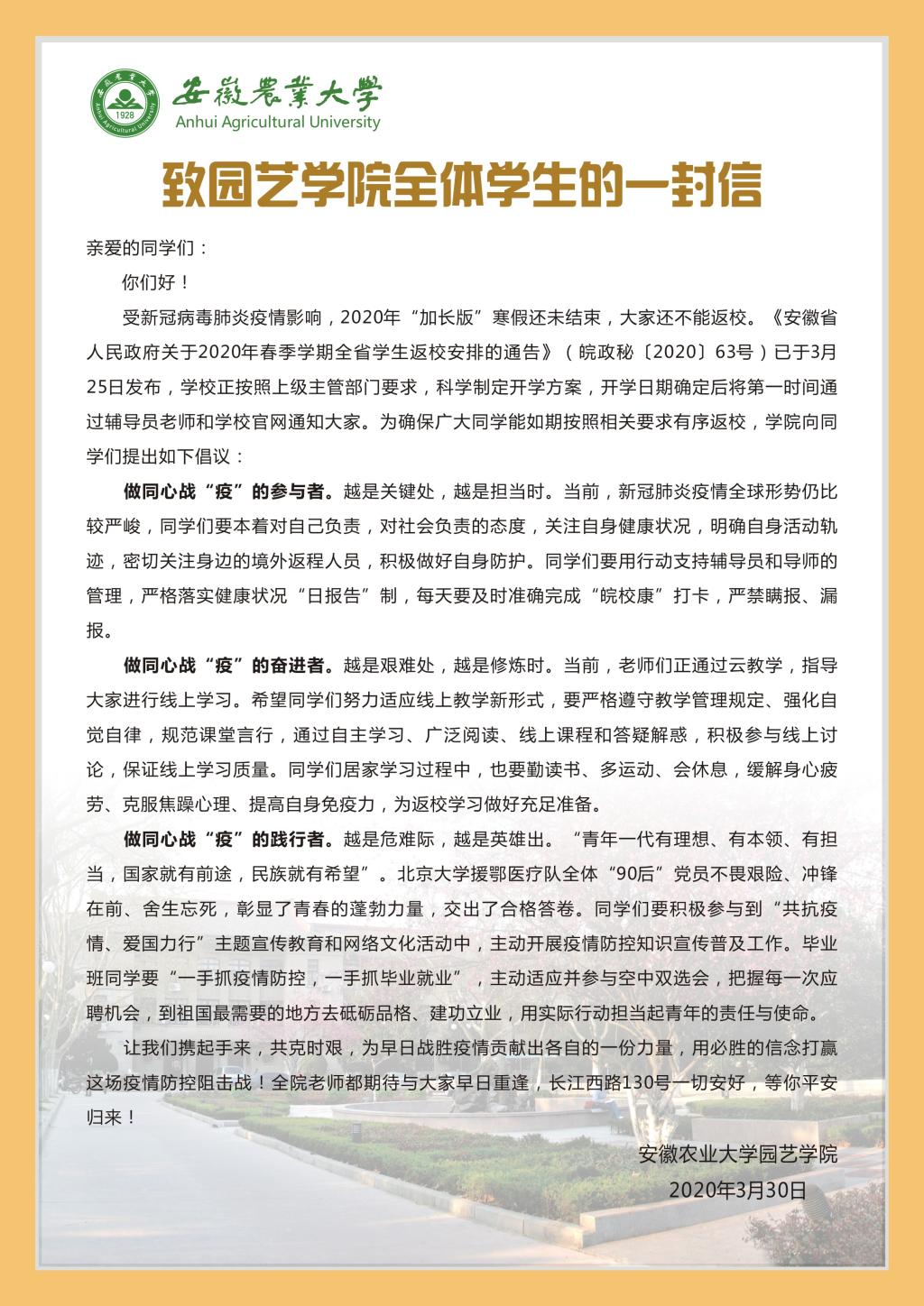 “发”倡议激励担当。主题教育期间,学院向全院学生发放《致园艺学院全体学生的一封信》,勉励学生积极应对疫情,激励园艺学子做同心战“疫”的参与者,严格落实健康状况“日报告”制;做同心战“疫”的奋进者,持续抓好线上学习,保证在特殊时期学习任务不减,学习质量不降;做同心战“疫”的践行者。学习北京大学援鄂医疗队全体“90后”党员不畏艰险、冲锋在前、舍生忘死的精神,积极参与到“共抗疫情、爱国力行”主题宣传教育和网络文化活动中,用实际行动担当起青年的责任与使命。