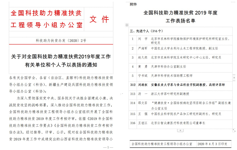 本网讯为深入贯彻落实党中央、国务院关于决胜全面建成小康、决战脱贫攻坚的战略部署,深入推动全国科技助力精准扶贫工作,近日,全国科技助力精准扶贫工程领导小组办公室组织开展了全国科技助力精准扶贫2019年度工作考核评审,茶与食品科技学院刘政权副教授被评为全国科技助力精准扶贫2019年度工作先进个人,这是刘政权老师继去年作为科技特派员受到科技部通报表扬后再获殊荣。