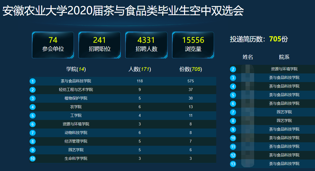 窗双选会共有74家用人单位参加,大多来自茶业和食品领域,专业对口度高。共计提供招聘职位数241个,招聘人数4331。截止4月18日23点,投递简历数达705份,其中茶与食品科技学院投递575份,总浏览量达15556次。