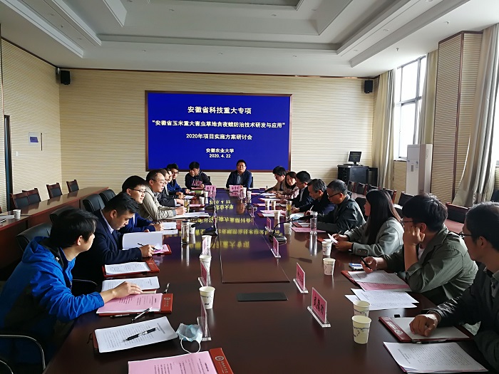 本网讯 4月22日,安徽省科技重大专项“安徽省玉米重大害虫草地贪夜蛾防治技术研发与应用” 2020年项目实施方案研讨会在植物保护学院圆满举行。学院副院长周权,安徽省农科院植安所副所长苏卫华研究员,安徽科技学院教研室主任黄保宏教授,安徽省植保总站科长邱坤,项目负责人李桂亭教授,课题负责人及骨干成员参会。会议由李桂亭教授主持。