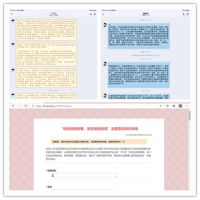 主题团日活动期间,院团委负责老师、学生兼职团委副书记、主要学生干部组成青年讲师团,深入“青马班”和各班级团支部,开展线上青年大宣讲,运用新冠肺炎疫情防控中的鲜活事例,通过视频、图片、大量事实数据等方式,讲述战“疫”中的中国制度和中国精神;院团委负责老师在学院微信公众号推送一期《共青团小课堂》,引导团员青年树牢制度自信,牢记习近平总书记嘱托,不忘初心跟党走。