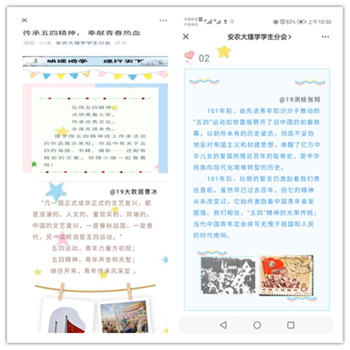 学院通过开展主题征文、主题演讲等方式,引导同学们坚定理想信念,传承红色基因。以“五四精神,传承有我”为活动主题,通过充分利用微信、QQ和易班等新媒体平台,广泛开展五四精神线上传承活动,团员青年们通过展示关于五四文学书籍、摄影、书法,海报,艺术,手工等内容,并附上文字感悟,让“五四精神”更加刻骨铭心,坚定成为“五四精神”的弘扬者、传播者、践行者。(通讯员:钟晨)