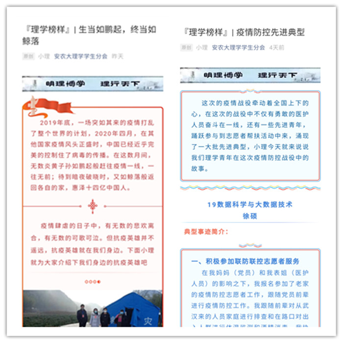 自新冠肺炎爆发以来,院团委鼓励团员青年参与志愿服务为疫情防控贡献力量。五四前夕,学院有2名同学获得校“网络文明优秀团员”和“素质提升优秀团员”,有7名同学获学院疫情防控先进典型。学院微信公众号推送他们的先进事迹,用身边普通同学的真人、真事和真情实感,引导团员青年见贤思齐、奋斗成才。