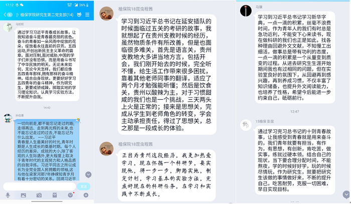 4月29日,学生党支部开展线上主题研讨。同学们围绕“中国梦、‘三农’梦和青春梦”展开了热烈的讨论,17动植物检疫的汪佳文说,“身为植保学子,我的梦想是做一名基层人员,为乡村振兴贡献自己的一份力量”;18级研究生叶梦迪说,“作为研究生,我们要努力学习、做好科研,这是我们对祖国的贡献”。