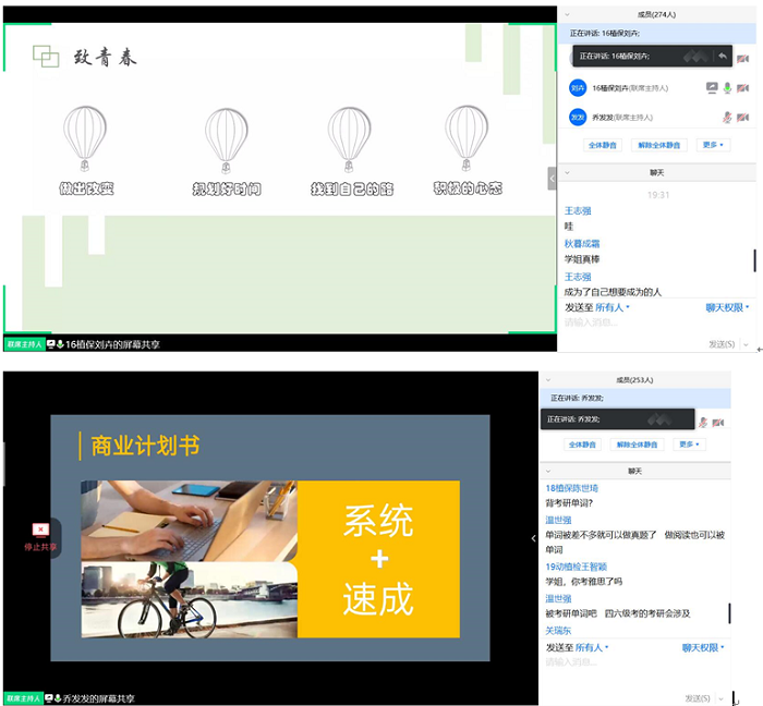 4月28日,2位优秀毕业生党员代表——16级植保专业刘卉和乔慧君应邀在线上与近300名学弟学妹进行座谈交流,在专题报告中,他们分享了自己的学业生涯规划、科技创新竞赛、社会实践拓展、自主学习管理等方面的经验与心得,鼓励同学们明确学习目标,找准努力方向,开拓视野、发掘潜力,全面提高自身综合素质,不负美丽青春。这两位优秀毕业生的分享,给予尚处于迷茫中的一些同学以极大的引导,他们纷纷表示,大学不应该处于舒适圈,要想有所成就,就必须从当下做起,把握美好的青春年华,规划人生目标,对自己负责,对青春负责。