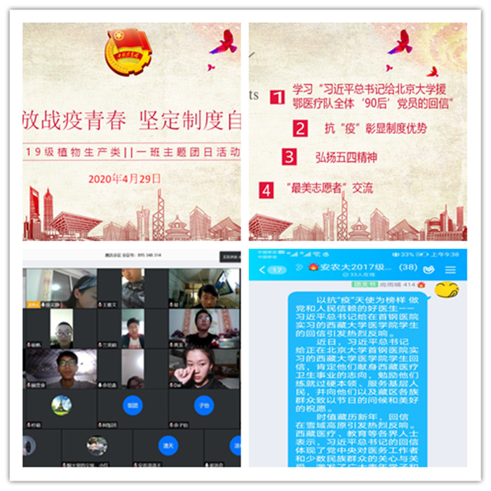 为深入学习广大“90后”、“00后”青年在此次战“疫”中的突出贡献,2019级植物生产类Ⅱ四班团支部和2017级园艺四班团支部分别通过QQ群和腾讯课堂组织团员观看了广大逆行者驰援武汉的视频,同学们通过讨论、对比世界各国在这场对抗疫情大考中的不同做法,感受到了中国力量、中国速度和中国精神,体会中国特色社会主义制度优越性。2019级植物生产类Ⅱ一班团支部在辅导员的带领下,重温习近平总书记给北京大学援鄂医疗队全体“90后”党员的回信精神,大家充分认识到我国社会主义制度能够集中力量办大事的政治优势。此外,2019级植物生产类Ⅱ二班、三班团支部还分别开展了“五四精神”学习研讨和“云分享战疫故事”等主题班会,由在抗疫工作中被评为“最美志愿者”的同学分享自己的战“疫”故事和工作感悟,引领大家共同感受抗击疫情的先进典型事迹,增强同学们爱国力行的使命和担当。