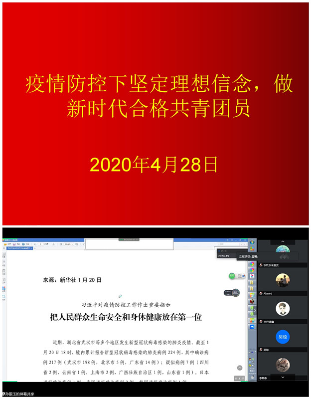 讲好青年故事,展现青春风采五四青年节前夕,学院在线上开展“青年之声·我与书记面对面”活动,老师们与青年学生线上面对面交流,心与心对接,鼓励同学们要坚定理想信念,胸怀大志,勤学苦练,同学们纷纷表示要勇于承担时代重任,厚植爱国主义情怀,万众一心,共克时艰。同时学院团委老师作了《疫情防控下坚定理想信念,做新时代合格共青团员》的专题宣讲,从重温团的历史、坚定理想信念、新时代青年的新使命、做一名优秀的共青团员、抗疫成就与中国特色社会主义制度优势等方面进行了详细的解读。