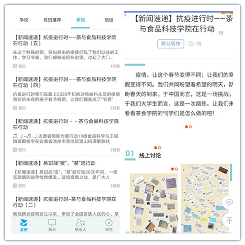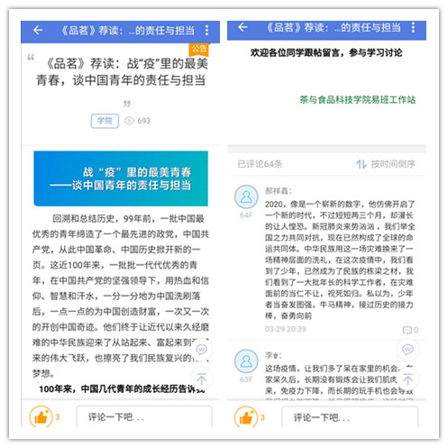 本网讯 新冠肺炎疫情发生以来,茶与食品科技学院易班工作站充分发挥易班平台优势,营造良好氛围,润物无声开展网络思想政治教育。