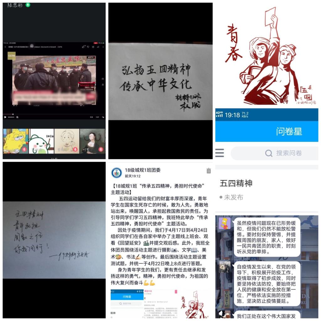 林院学子不断学习新思想提高团务意识。我院围绕五四精神有序开展线上团日活动,在疫情之下,给予学生更深刻的思想启发。18和19级城乡规划团支部开展《回望延安》观影活动,组织团员就观后感进行线上讨论,同时组织团员进行线上答题,加深团员对五四精神及习近平新时代中国特色社会主义思想的认识;19级材料团支部通过录制手写和绘画成果,担负青年责任,发扬五四精神。